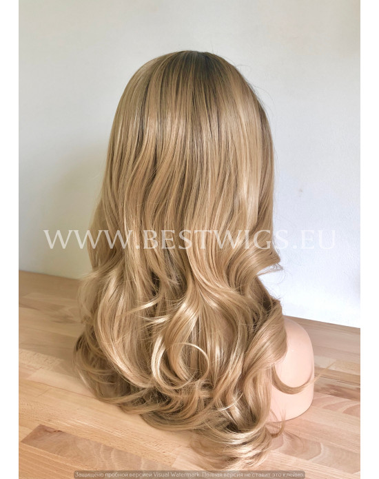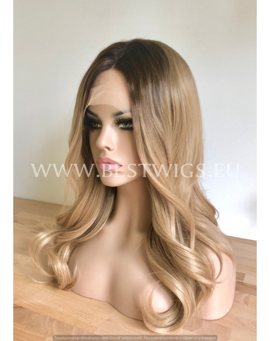 Synthetic lace front wig Wavy rooted caramel blonde / middle parting