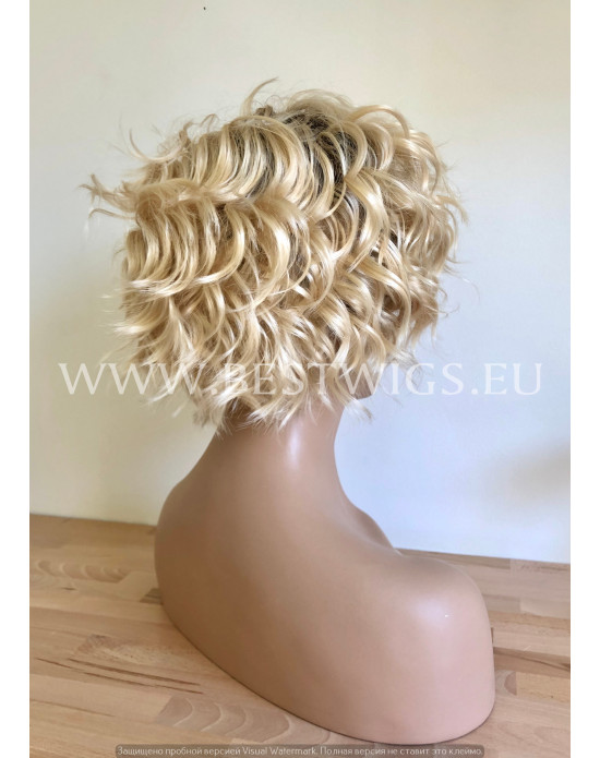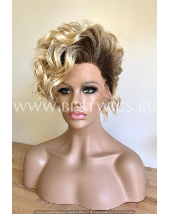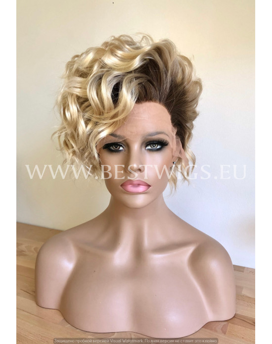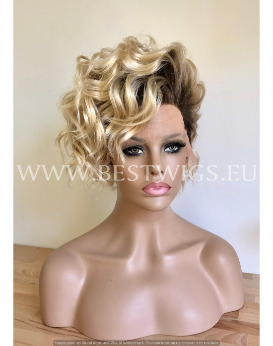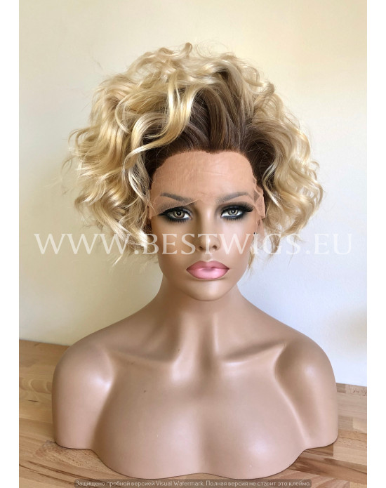 Synthetic lace front wig Curly Blond Short hair dark roots / Double volume